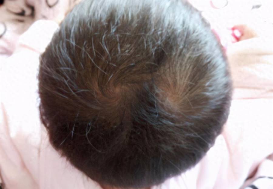 前邊我們也說了,頭頂「旋」的生成其實是一種正常的生理現象,有的孩子一出生就是一個旋,有的則是兩個三個,有的甚至是四個。